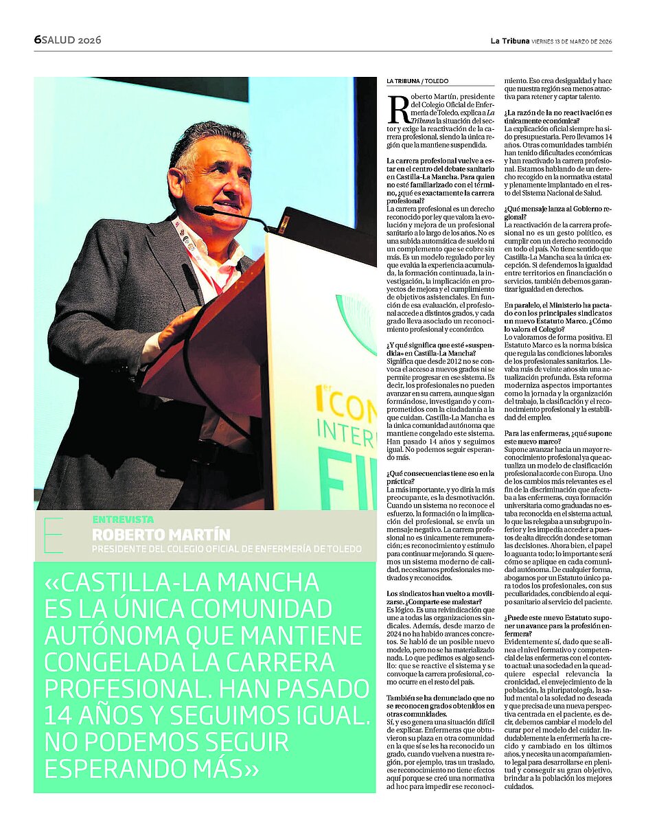 Por su interés, publicamos la entrevista al presidente del COENTO, publicada hoy 13 de abril en el especial Salud de La Tribuna de Toledo, en la que nuestro Colegio exige la reactivación de la carrera profesional en el SESCAM.